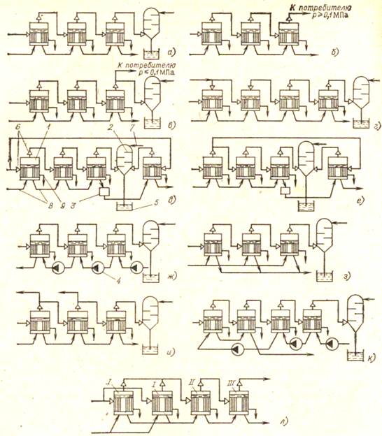 а — прямоточная с конденсатором; б — прямоточная с противодавлением; в — с ухудшенным вакуумом; г —с нуль-корпусом; д — двухстадийная с обогревом аппарата второй стадии свежим паром; е— двухстадийная с обогревом аппарата второй стадии вторичным паром первой ступени; ж — противоточная; з —с параллельным током пара и раствора; и—с отбором экстрапаров посторонним потребителем; к — со смешанным током раствора; л — трехступенчатая с двумя корпусами в первой ступени; 1 — выпарной аппарат; 2 — конденсатор; 3 — солеотделитель; 4— насос: 5 — водосборник; в — вход первичного и выход вторичного пара; 7 — вход охлаждающей воды; S — вход и выход раствора; 9 — выход конденсата