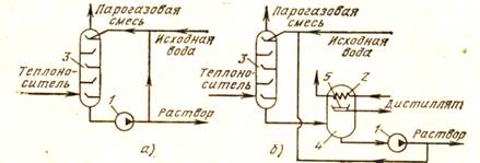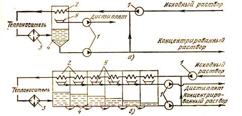 а — одноступенчатая; б — многоступенчатая; 1— насосы; 2 — конденсаторы; 3 — головной подогреватель; 4 — камеры выпаривания; 5 — поддоны