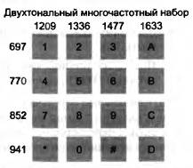В ТфОП наибольшее распространение получил двухтональный многочастотный набор (DTMF – Dual Tone Multi Frequency). Сигналы вызова передаются внутри полосы речевого канала, поэтому метод называют внутриполосным. Цифровая клавиатура представляет собой матрицу 4х4, где каждый ряд соответствует низкой частоте, а столбец – высокой. Нажатие одной из клавиш приводит к передаче в линию синусоидального тона из 2-х частот.