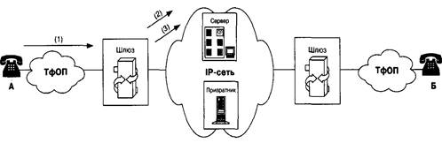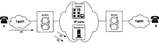 Рассмотрим процедуру установления соединения через сеть IP при вызове с предоплатой или с оплатой после разговора. Для организации такого соединения абонент А набирает местный телефонный номер шлюза своего поставщика услуг IP-телефонии. Абоненту А передается второй сигнал ответа станции и предлагается ввести телефонный номер вызываемого абонента, номер счёта и пароль, если вызов производится не с домашнего, зафиксированного у поставщика телефона. Далее устанавливается соединение со стороной вызываемого абонента В. На рис.1.6 приведены компоненты IP-телефонии, которые обычно используются в таком соединении.