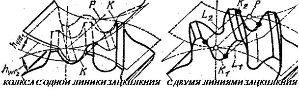 В ней зубья каждого колеса имеют вогнутые ножки и выпуклые головки. Передачи с двумя линиями зацепления обладают большей несущей способностью, менее чувствительны к смещению осей, работают с меньшим шумом и более технологичны. Эти передачи успешно применяются при малых числах зубьев (Z1 < 10) и дают достаточную жёсткость шестерён при их большой относительной ширине.