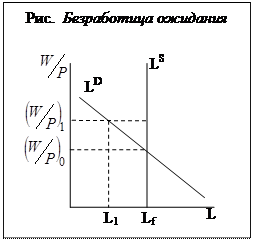 При ставке заработной платы (W/P)0 рынок труда находится в равновесии на уровне полной занятости рабочей силы (Lf). Однако если ставка заработной платы будет установлена на уровне(W/P)1, то предложение труда L1 превысит спрос на труд, и нанято будет только количество рабочих, равное L1. Разница между L1 и L2 составит безработицу ожидания, которая может исчезнуть только тогда, когда ставка заработной платы будет cнова равна равновесной (W/P)0.