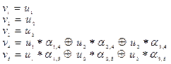 Запишем в виде формул процедуру нахождения символов кодового слова для линейного кода с параметрами (5, 3), если задана некоторая информационная последовательность из трех символов U=(u1,u2,u3). Кодовое слово будет содержать 5 символов V=(v1,v2,v3,v4,v5).