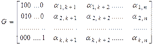 Первые k столбцов представляют собой единичную матрицу размером k x k, следующие n-k столбцов представляют совокупность коэффициентов al,i (матрица проверочных элементов).
