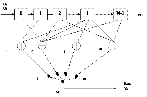 При поступлении на вход кодера каждого информационного символа Ui мультиплексор М последовательно считывает за один такт сигналы с выходов всех сумматоров по модулю 2, формируя на выходе m символов Vi. Таким образом, при скорости входной последовательности Ввх бит/с скорость выходной последовательности составляет Ввых=mВвх бит/с.