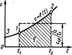Для уяснения методики определения средней теплоемкости по указанным таблицам воспользуемся рис. 2. Истинной теплоёмкости соответствует кривая 3, определяемая зависимостью c = f(t). Заштрихованная под ней площадь эквивалентна количеству теплоты q, необходимому для нагревания 1 кг рабочего тела от температуры t1 до t2: