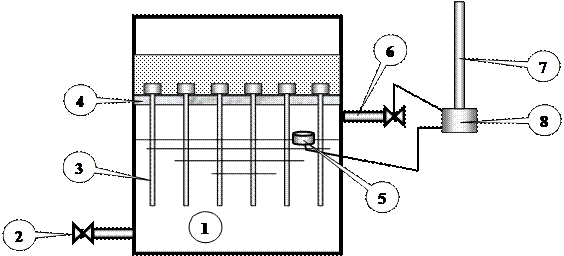 Рис.5.28 Фрагмент фильтра с пульсирующей промывкой фирмы «Дегремон»: 1 –подон фильтра; 2 – трубопровод подачи промывной воды; 3 –дренажный колпачок; 4 – дренажная плита; 5 – поплавок регулятора; 6 – трубопровод подачи сжатого воздуха; 7 – воздушная трубка; 8 - регулятор.
