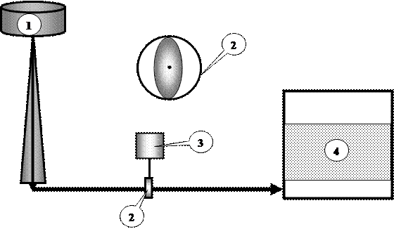 Рис.5.29 Схема реализации пульсирующей промывки: 1 – башня промывной воды; 2 – поворотный дисковый затвор; 3 – командоаппарат; 4 – фильтр.