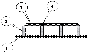Рис. 5.32 Лотковый полимербетонный дренаж: 1 – дно фильтра; 2 – бетонные стенки; 3 – полимербетонная плита; 4 – заделка стыка полимербетоном.