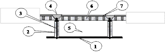 1 – дно фильтра; 2 – ж/б опоры; 3 - анкер; 4 – заделка стыка цементом; 5 – поддон фильтра; 6 – ж/б дырчатая плита; 7 – полимербетон.