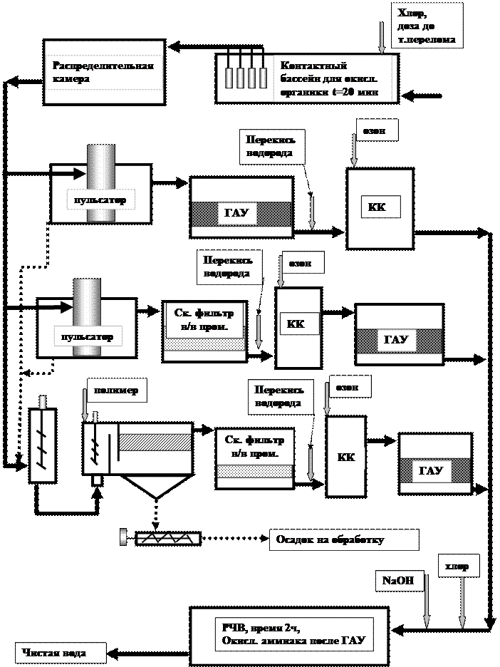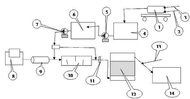 На НФС-2 предложено ввести ПАУ и УФ вместо первичного хлорирования. Для ПАУ использовать реагентное хозяйство: уголь замачивается в контейнерах горячей водой на 6-8ч, выгружается в растворные баки и доводится до 10% концентрации. Насосами перекачивается в расходные баки и разбавляется до 1% концентрации и насосом-дозатором подается в смеситель или перед КО или СФ. Дозы ПАУ от 3 до 10 мг/л. Схема реконструкции дана на рис.: 1- контейнер с ПАУ; 2- воздух; 3- вода; 4- роастворный бак; 5- насос; 6- расходный бак; 7- насос-дозатор; 8- контактная камера с МКФ; 9- УФ лампа для первичного обеззараживания; 10- смеситель; 11- шайбовый смеситель; 12 – КО; 13- ввод хлора для обеззараживания; 14- РЧВ.