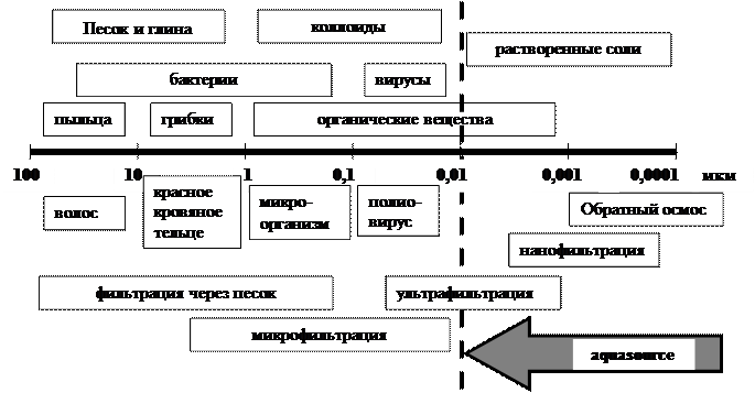 Наилучшим образом для подготовки питьевой воды подходят, прежде всего, микропористые и полупроницаемые мембраны. Они обычно имеют композитную структуру (собственно мембрана толщиной 0,1-1,5 мкм и несущая основа толщиной 100-200 мкм), а основной и наиболее важной их характеристикой является пористость (порог отсечения), который и определяет размер улавливаемых ими микрочастиц любого происхождения (рис.5.58)