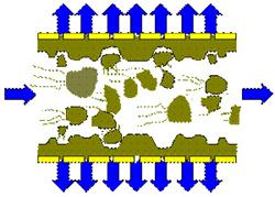 В процессе работы УФ-мембраны на ее поверхности образуется более или менее компактный, в зависимости от природы воды, слой загрязнений, который достаточно быстро, если речь идет о режиме фронтального фильтрования, снижает ее проницаемость и, следовательно, производительность по фильтрату.