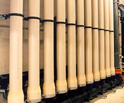 Фильтрование может осуществляться под давлением либо под вакуумом. В аппаратах фирмы «Дегремон» процесс идет под давлением порядка 1-1,5 бара при движении потока изнутри полого волокна наружу. Фирма «Зенон» предлагает аппараты вакуумного фильтрования с движением потока снаружи внутрь полого волокна (рис. 5.61). При вакуумной фильтрации мембранный блок погружают в ванну (резервуар), внутри полого волокна создается вакуум порядка 8 м, что обеспечивает движение потока в сборный резервуар чистой воды.