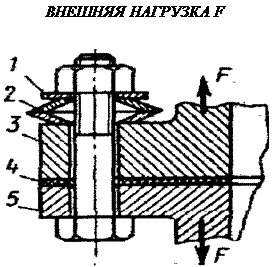 В таких соединениях наборы упругих прокладок (шайб, тарельчатых пружин) существенно увеличивают податливость системы болта, а, следовательно, уменьшают нагрузку на болт.