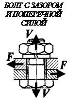 Соединение нагружено поперечной силой F. Сила затяжки болта V должна дать такую силу трения между деталями, которая была бы больше поперечной сдвигающей силы F. Болт работает на растяжение, а от момента затяжки испытывает ещё и кручение, которое учитывается повышением нормальных напряжений на 30% (в 1,3 раза).