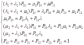 Все характеристики для заявок 1го типа могут быть получены, игнорируя заявки 2го типа и, рассматривая задачу так, как будто на 2х канальную СМО с отказами поступают заявки только 1го типа.