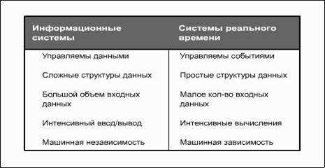 Главные отличия информационных систем от систем реального времени приведены в таблице 1, средствами поддержки этих особенностей и различаются соответствующие структурные методологии.Таблица 1