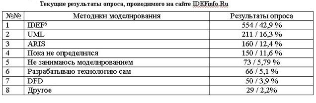 В таблице приведены результаты опроса, проводимого и опубликованного на сайте IDEFinfo.Ru "Какой технологии (функционального моделирования) Вы отдаёте своё предпочтение?" Опрос проводится с 13 апреля 2005 года. На 1 октября 2008 года опрошено 1292 человека.