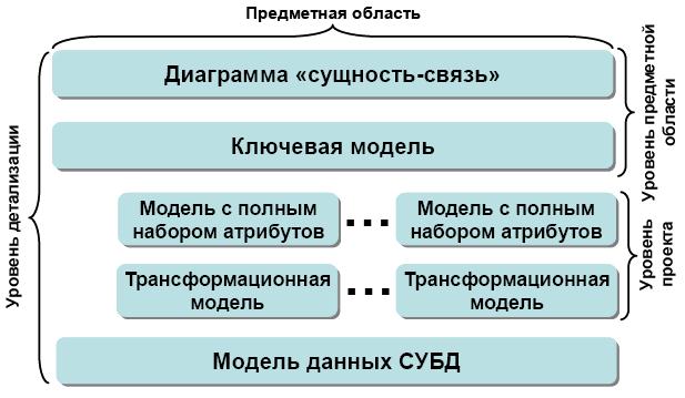 Уровни моделирования данных делятся на общие модели, изображающие сущности в общем не детализированном виде, содержащем сущности важные для рассматриваемой предметной области и модели, детально изображающие взаимосвязи между сущностями предметной области в терминах конкретной СУБД, выбранной для реализации модели данных. Таким образом, на самом нижнем уровне представления модели в значительной степени зависят от выбранной реализации (СУБД) и, следовательно, модель, созданная для использования в СУБД Access будет значительно отличаться от SQL Server и тем более Oracle. Модели верхнего уровня технологически независимы и могут содержать информацию об элементах, физически не сохраняемых в БД.