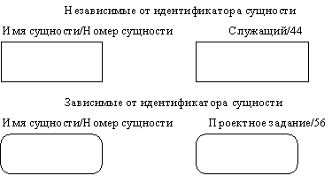 Типы сущностей. Сущность в методологии IDEF1X является независимой от идентификаторов или просто независимой, если каждый экземпляр сущности может быть однозначно идентифицирован без определения его отношений с другими сущностями. Сущность называется зависимой от идентификаторов или просто зависимой, если однозначная идентификация экземпляра сущности зависит от его отношения к другой сущности (рисунок 2.30).