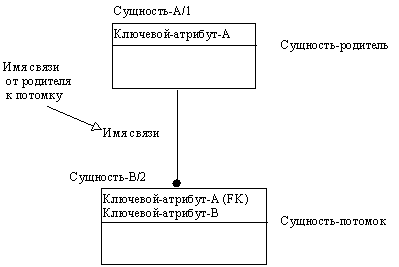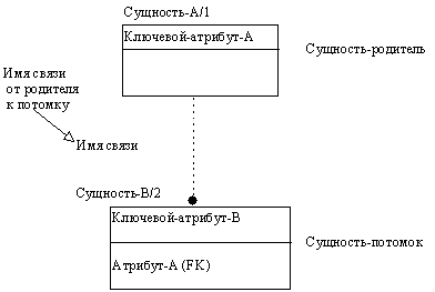 Идентифицирующая связь между сущностью-родителем и сущностью-потомком изображается сплошной линией (рисунок 2.32). Сущность-потомок в идентифицирующей связи является зависимой от идентификатора сущностью. Сущность-родитель в идентифицирующей связи может быть как независимой, так и зависимой от идентификатора сущностью (это определяется ее связями с другими сущностями).