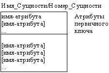 Ключи. Атрибуты изображаются в виде списка имен внутри блока сущности. Атрибуты, определяющие первичный ключ, размещаются наверху списка и отделяются от других атрибутов горизонтальной чертой (рисунок 2.34).