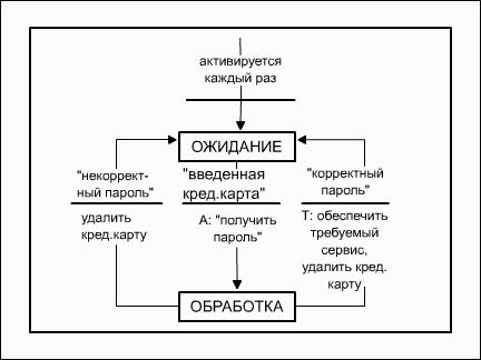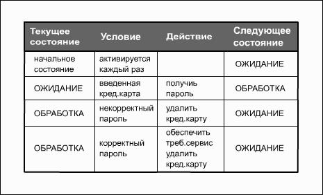 Рис. 6.2: STD для банковской задачиПри построении STD рекомендуется следовать правилам:· строить STD на как можно более высоком уровне детализации DFD;· строить как можно более простые STD;· по возможности детализировать STD;· использовать те же принципы именований состояний, событий и действий, что и при именовании процессов и потоков.Применяются два способа построения STD. Первый способ заключается в идентификации всех возможных состояний и дальнейшем исследовании всех не бессмысленных связей (переходов) между ними. По второму способу сначала строится начальное состояние, затем следующие за ним и т.д. Результат (оба способа) - предварительная STD, для которой затем осуществляется контроль состоятельности, заключающийся в ответе на следующие вопросы:· все ли состояния определены и имеют уникальное имя?· все ли состояния достижимы? · все ли состояния имеют выход? · (для каждого состояния) реагирует ли система соответствующим образом на все возможные условия (особенно на ненормальные)? · все ли входные (выходные) потоки управляющего процесса отражены в условиях (действиях) на STD?В ситуации, когда число состояний и/или переходов велико, для проектирования спецификаций управления могут использоваться таблицы и матрицы переходов состояний. Обе эти нотации позволяют зафиксировать ту же самую информацию, что и диаграммы переходов состояний, но в другом формате. В качестве примера таблицы переходов состояний приведена таблица 6.1, соответствующая рассмотренной диаграмме переходов состояний (рис. 6.2). Первая колонка таблицы содержит список всех состояний проектируемой системы, во второй колонке для каждого состояния приведены все условия, вызывающие переходы в другие состояния, а в третьей колонке – совершаемые при этих переходах действия. Четвертая колонка содержит соответствующие имена состояний, в которые осуществляется переход из рассматриваемого состояния при выполнении определенного условия. Таблица 6.1