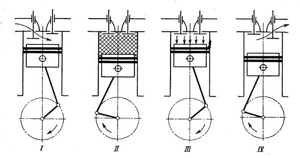 | Рис.1. Рабочий чикл четырехтактного ДВС: I – впуск свежего заряда; II – сжатие; III – рабочий ход; IV – выпуск отработавших газов. |