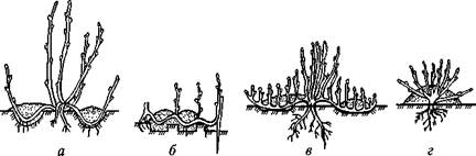При отведении побегов в канавки дужкой (рис. 1, а) вокруг маточного куста по числу отводковых побегов выкапывают ямки глубиной 10—15 см и более в зависимости от длины побега. Побеги отгибают и пришпиливают на дне в средней части шпильками или крючьями, а верхушку побега изгибают вверх и привязывают к вертикально установленному колышку. Ямки засыпают рыхлой плодородной землей.