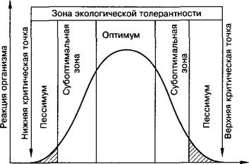 Факторы среды имеют количественное выражение. По отношению к каждому фактору можно выделить зону оптимума (зону нормальной жизнедеятельности), зону пессимума (зону угнетения) и пределы выносливости организма. Оптимум – такое количество экологического фактора, при котором интенсивность жизнедеятельности организмов максимальна. В зоне пессимума жизнедеятельность организмов угнетена. За пределами выносливости существование организма невозможно. Различают нижний и верхний предел выносливости.