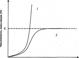 J-образная кривая (1) отражает неограниченный экспоненциальный рост численности популяции, не зависящий от плотности популяции. Такой тип роста возможен пока биотический потенциал популяции (r) реализуется полностью. Это продолжается, пока низка конкуренция за ресурсы. Однако после превышения емкости среды (предельной плотности насыщения, предельной численности) (К), произойдет резкое снижение численности.