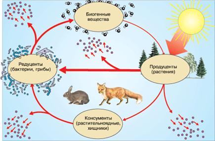 В экосистеме органические вещества синтезируются автотрофами из неорганических веществ. Затем они потребляются гетеротрофами. Выделенные в процессе жизнедеятельности или после гибели организмов (как автотрофов, так и гетеротрофов) органические вещества подвергаются минерализации, то есть превращению в неорганические вещества. Эти неорганические вещества могут быть вновь использованы автотрофами для синтеза органических веществ. Так осуществляется биологический круговорот веществ.