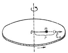 (и, следовательно, превратится в неинерциальную систему отсчета), то благодаря трению тело тоже будет вовлечено во вращение. Вместе с тем оно будет перемещаться в радиальном направлении от центра платформы до тех пор, пока возвращающая сила упругости не остановит это перемещение. Тогда тело начнет вращаться на расстоянии r от центра О. С точки зрения наблюдателя, связанного с платформой, перемещение шара относительно нее обусловлено некоторой силой