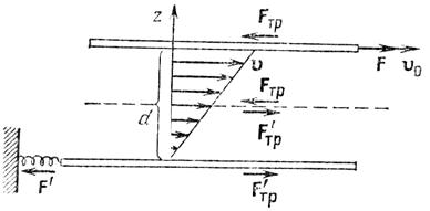 Рассмотрим следующий опыт. В жидкость погружаются две параллельные друг другу пластины (рис. 4.2) на расстоянии d друг от друга. Нижняя пластина удерживается на месте, верхняя приводится в движение относительно нижней с некоторой скоростью v 0. Для перемещения верхней пластины со скоростью v 0 на нее необходимо действовать с постоянной силой