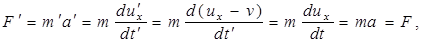 Покажем, что второй закон Ньютона инвариантен относительно преобразований Галилея. Для этого рассмотрим, как преобразуются масса и ускорение при переходе из одной системы отсчета в другую. В классической механике масса тела является инвариантной величиной (m = m'), ход времени во всех ИСО одинаков (t= t'), и закон сложения скоростей выглядит таким образом: