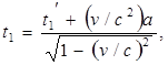 Продолжительность явления. Пусть в одной и той же точке с координатой х ' = а системы К' происходит явление, которое начнется в момент времени t 1' и закончится в момент времени t 2'. Согласно преобразований Лоренца этим событиям соответствуют в системе К моменты времени