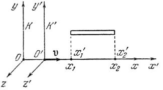 Длина тел в разных системах. Рассмотрим стержень, расположенный вдоль оси х 'и покоящийся относительно системы отсчета К' (рис. 5.1). Длина его в этой системе l 0 = x 2'- x 1', где х 1' и х 2' – не изменяющиеся со временем t ' координаты концов стержня. Относительно системы К стержень движется со скоростью v. Для определения его длины в этой системе нужно отметить координаты концов стержня х 1 и х 2 в один и тот же момент времени t 1= t 2 = b. Их разность l = x 2 – x 1 дает длину стержня, измеренную в системе К. Чтобы найти соотношения между l 0 и l, следует взять ту из формул преобразований Лоренца, которая содержит х ', х и t.
