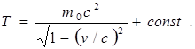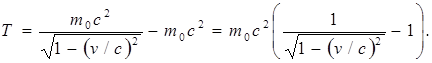 При v = 0, m = m 0 и Т = 0. Отсюда для константы получается значение, равное – m 0 c 2. Следовательно, релятивистское выражение для кинетической энергии частицы имеет вид