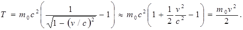 Мы пришли к ньютоновскому выражению для кинетической энергии частицы. Этого и следовало ожидать, поскольку при скоростях, много меньше скорости света, все формулы релятивистской механики должны переходить в соответствующие формулы ньютоновской механики.