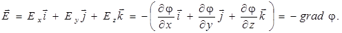 Напряженность в какой-либо точке электростатического поля равна градиенту потенциала (см. Приложение) в этой точке, взятому с обратным знаком.