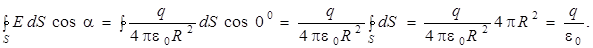 Покажем справедливость теоремы для случая поля точечного заряда. Пусть замкнутая поверхность представляет собой сферу радиусом R, в центре которой находится точечный положительный заряд q (рис. 7.2а).
