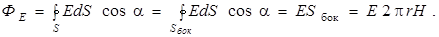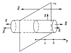 2-й этап. Выбираем замкнутую поверхность в виде цилиндра, образующая которого перпендикулярна к плоскости (рис. 7.3). Тогда поток Ф Е через боковую поверхность будет равен нулю (α =900, линии