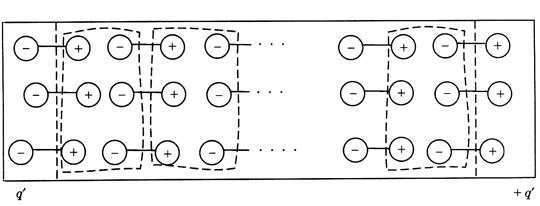 Из рисунка 7.7 видно, что внутри происходит компенсация зарядов соседних молекул. Некомпенсированными остаются заряды молекул на противоположных гранях диэлектрика, они называются связанными зарядами, поскольку находятся внутри молекул и не могут свободно перемещаться по всему объему диэлектрика.