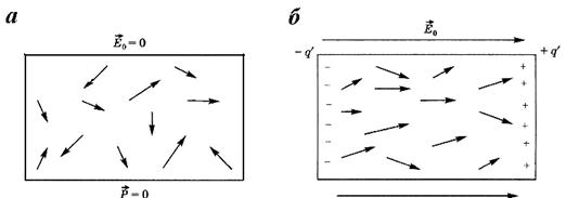 разбросаны хаотически по всем направлениям, следовательно, диэлектрик не поляризован (рис. 7.8а). Во внешнем электрическом поле его силы стремятся установить дипольные моменты молекул вдоль поля
