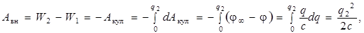 Выведем формулу для энергии заряженного проводника. Рассмотрим работу внешних сил по увеличению заряда проводника от q 1 = 0 до q 2. Для этого будем малыми порциями dq перемещать заряд из бесконечности на поверхность проводника. При этом работа внешней силы будет совершаться против кулоновской силы отталкивания одноименных зарядов и поэтому