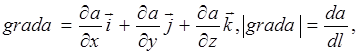 2. Градиент скалярной величины a. Пусть в пространстве каким-либо образом распределена скалярная величина а – это может быть поле температуры (а = Т), потенциальной энергии (а = U) и т. д. Такое поле можно охарактеризовать градиентом а. Под градиентом скалярной величины понимают вектор, который в каждой точке пространства направлен в сторону наиболее быстрого возрастания а и численно равный приращению величины а на единицу длины этого направления.