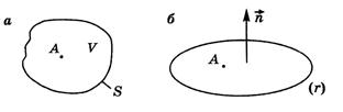 Возьмем объем поля V, ограниченного замкнутой поверхностью S, и будем стягиватьповерхность в малую окрестность точки А (рис. П.4 а)
