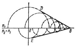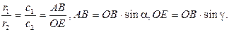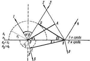 Из формулы (3.2) следует, что при α = 0 будет и γ = 0 (так как с 1/ с 2 ≠ 0), т. е. луч, падающий нормально на границу раздела сред, не преломляется. Обозначим