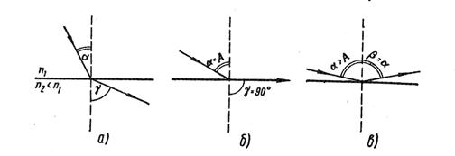 Если свет проходит из оптически более плотной среды в оптически менее плотную среду, например, из стекла в воду, то, согласно формуле (3.3), угол падения αбудет меньше угла преломления γ (рис. 3.3 а). Поэтому при некотором угле падения (α = А) угол преломления окажется равным 90°, т. е. преломленный луч будет скользить вдоль границы раздела сред, не входя во вторую среду (рис. 3.3б). Угол А называется предельным углом падения. При α > А свет полностью отражается в первую среду (рис. 3.3 в). Это явление называется полным внутренним отражением света.
